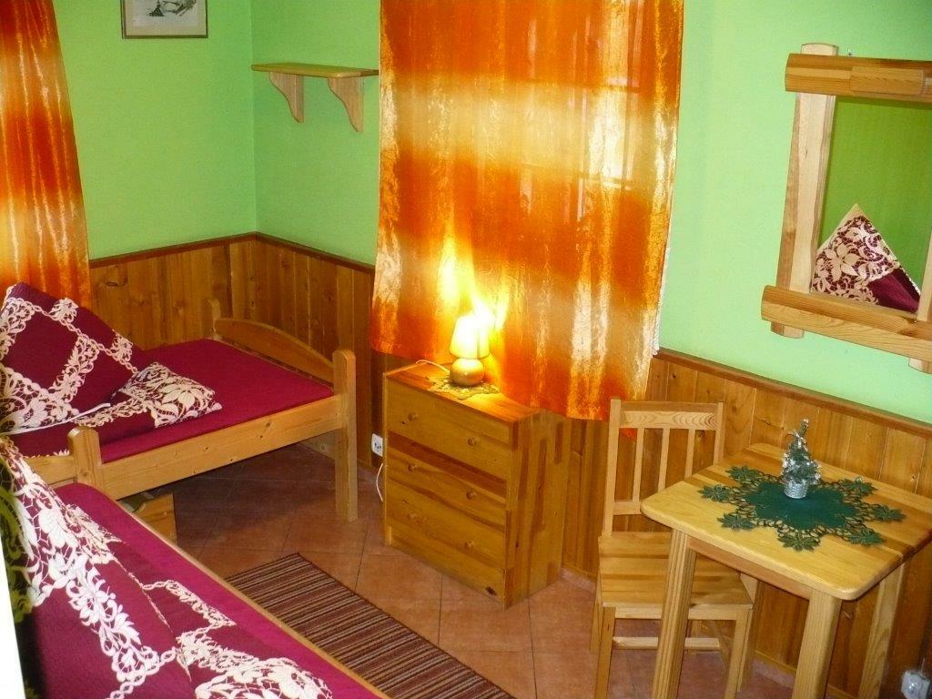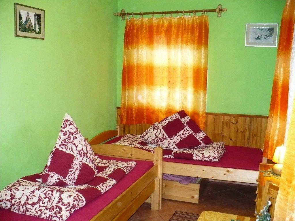 Pokój o powierzchni ok. 15m2, ma trzy okna z widoiem na podwórze i łąkę górską. Dwa łóżka o wymiarach 90cmx200cm.